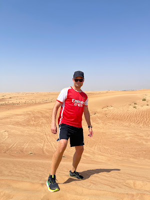 För att säkert få känna på värmen i dess yttersta form hade jag bokat en ökenrundtur där man först åker bil i 1,5h för att plocka upp andra turister och sedan är man småningom ett stenkast från Oman. Ute i öknen finns ställen där de har kamelfarmer, uthyrning av fyrhjulingar, quadbike (mönkkijä på finska) och ett som annat. Jag och en annan turist från Portugal red på kamel 100 meter, det hade jag testat på Lanzarote för 30 år sedan men nu ville jag testa det igen. Fyra av oss turister hyrde fyrhjuling i en halvtimme och gasade runt i öknen i ett inhägnat område. På det här viset fick man känna på värmen och testa att röra sig i sanden lite mer. Vi fick kylda vattenflaskor innan vi for vidare mot en ännu mer äkta öken. Då vi kommit en bit ut i en rätt oändlig öken så släppte chauffören ut lite luft ur alla däck och då gick det att köra hårt och häftigt ovanpå sanddynerna. Det fanns stänger i taket så vi kunde hålla i oss. Chauffören som var från Pakistan spelade rätt fin arabisk musik och det var roligt. Ingen hade någon sändning på mobiltelefonerna då vi kom längre in i öknen. Vi såg någon annan grupp som också var ute och körde. Vi körde rätt länge och det var rolig stämning. Ett par var från Rumänien men bodde i Österrike. Mannen hade varit i Rovaniemi och skulle dit på semester nu i december igen. Sanddynerna påminner lite om fjäll med snö. Vi stannade och testade sandboarding vilket inte var så långt ifrån snowboarding, fötterna satt dock inte fast vilket gjorde det svårt. Många satt ner på brädan och åkte ner på så vis. Vi som åkt snowboard förr hade nog en chans att åka lite men fötterna satt som sagt inte fast vilket gjorde det svårt.